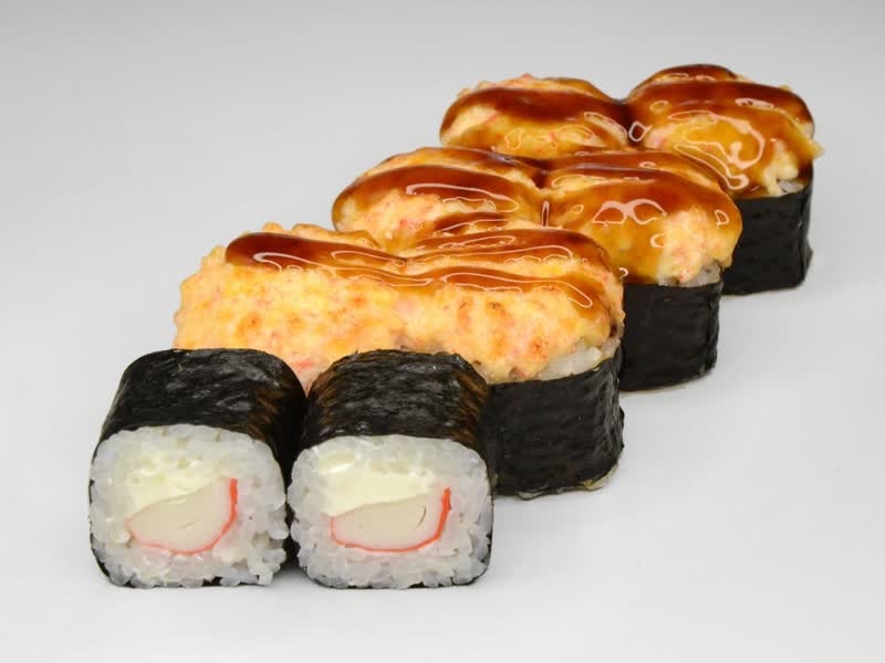 Крабовые палочки, сырный соус, соус унаги, рис, сыр, нори