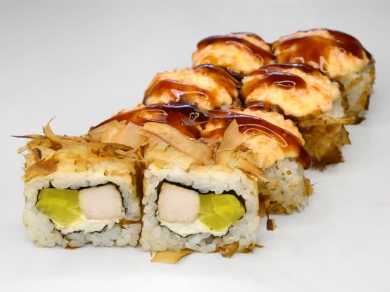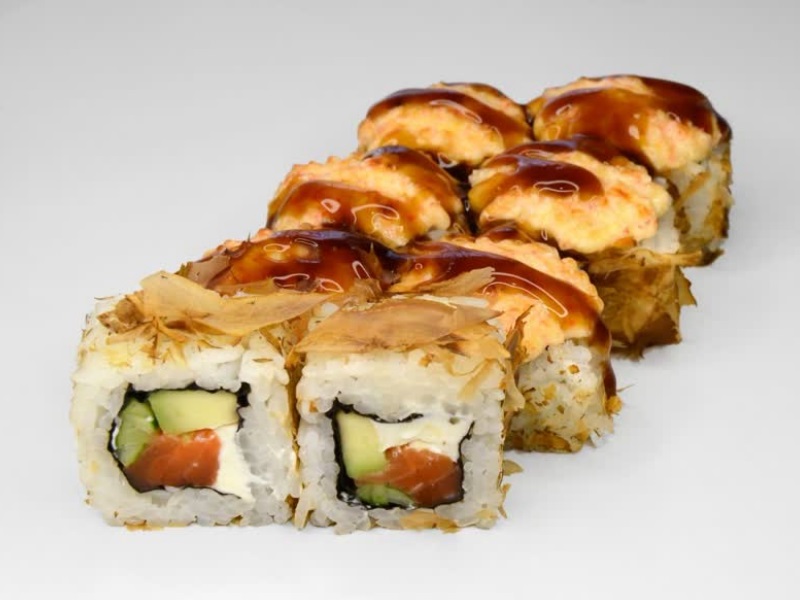 Лосось, авокадо, стружка тунца, сырный соус, соус унаги, рис, сыр, нори