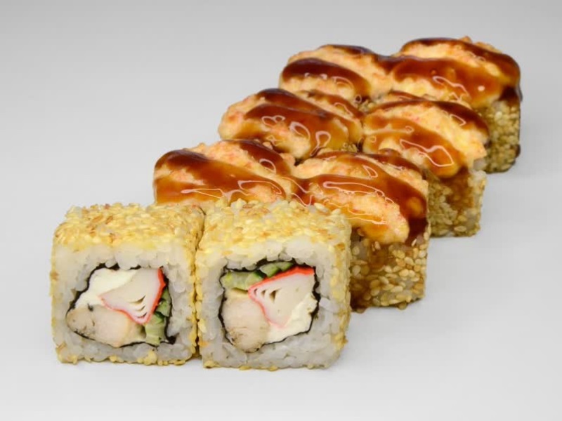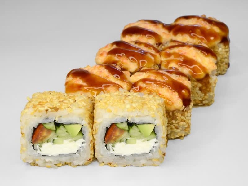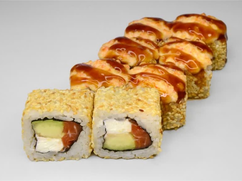 Лосось, авокадо, сырный соус, кунжут, соус унаги, рис, сыр, нори
