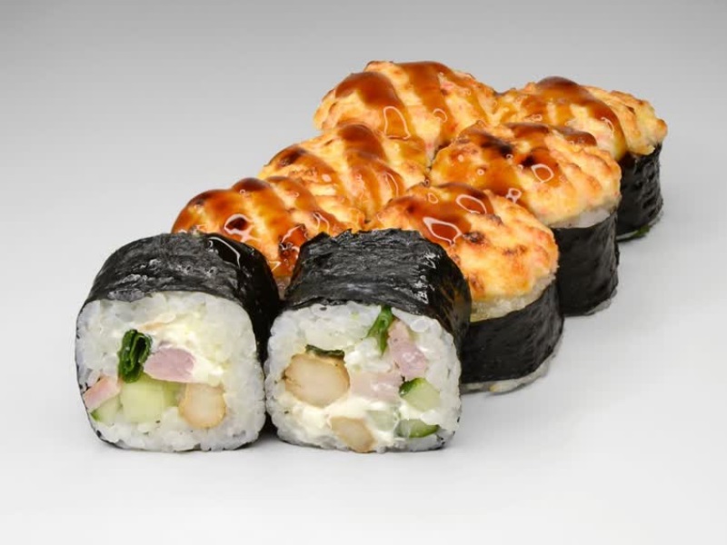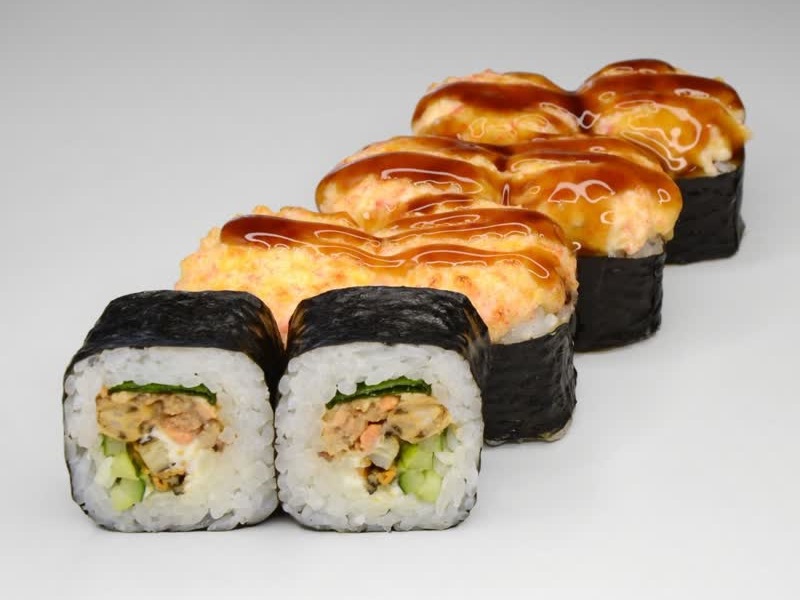 Мидии, лосось терияки, огурец, лук, сырный соус, соус унаги, рис, сыр, нори