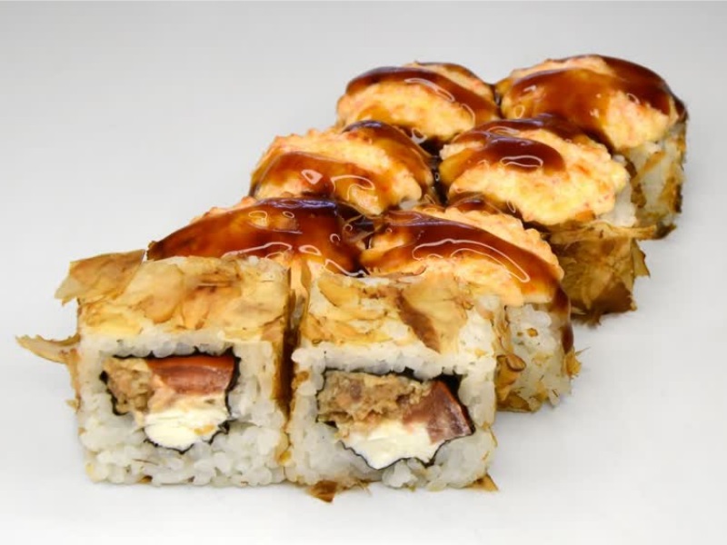 Лосось терияки, томат, сырный соус, стружка тунца, соус унаги, рис, сыр, нори