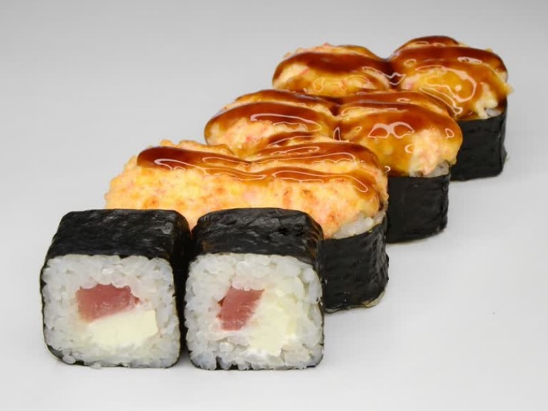 Тунец, сырный соус, соус унаги, рис, сыр, нори