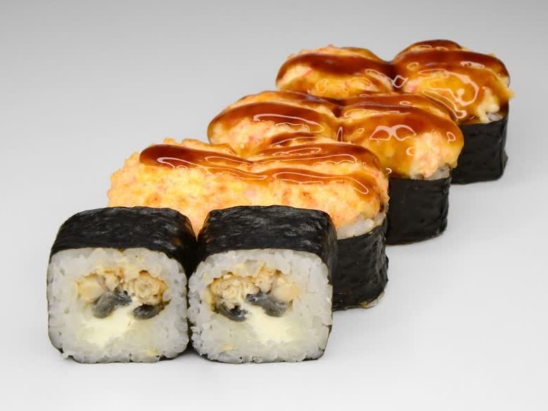 Угорь, сырный соус, соус унаги, рис, сыр, нори