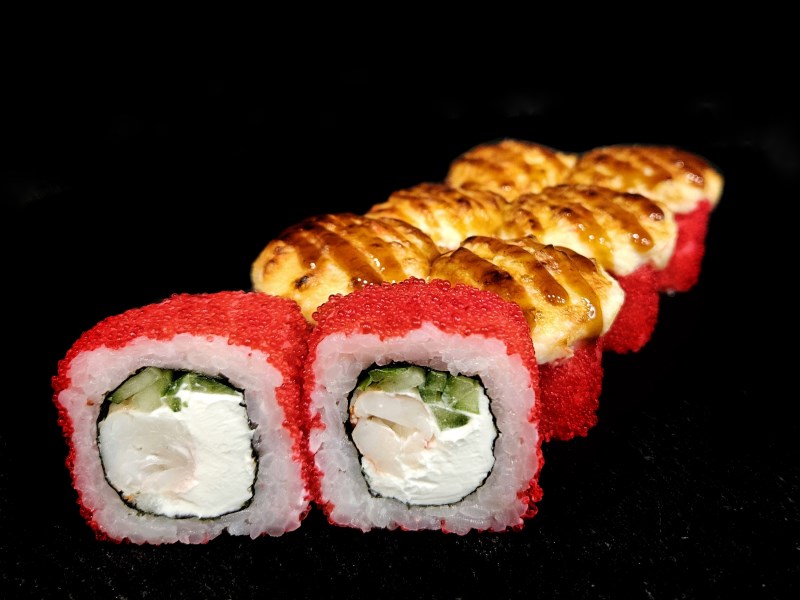 Креветки, огурец, икра тобико, сырный соус, соус унаги, рис, сыр, нори