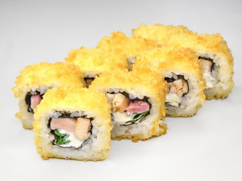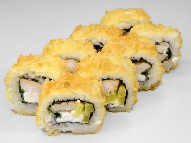 Курица, такуан, лук, темпура, острый соус, соус унаги, рис, сыр, нори