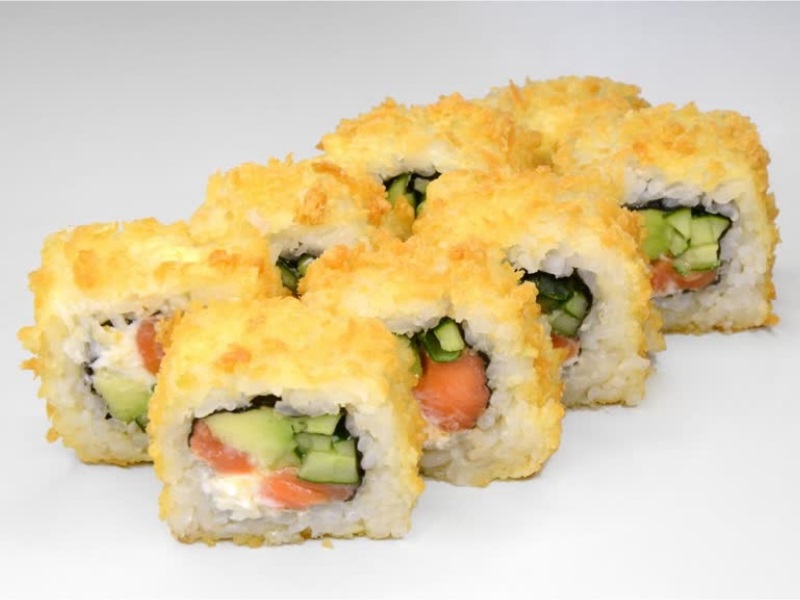 Лосось, огурец, авокадо, темпура, соус унаги, рис, сыр, нори