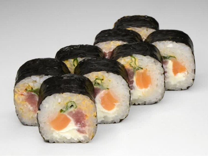 Тунец, лосось, лук, соус острый, рис, сыр, нори