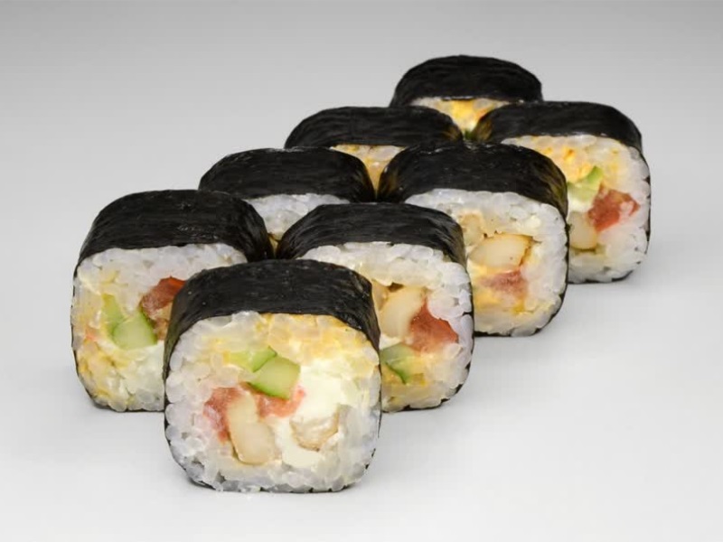 Лосось, креветки, икра тобико, рис, сыр, нори
